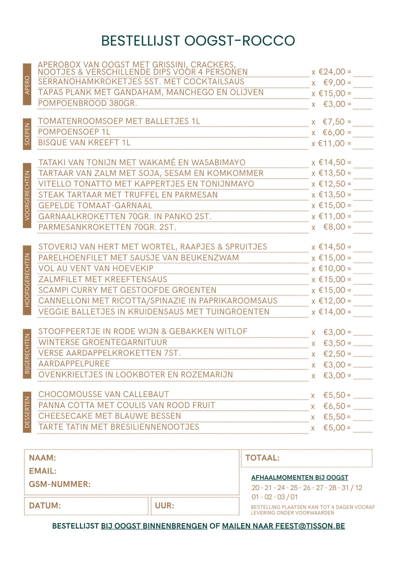 Bestellingen plaatsen kan via feest@tisson.be of de lijst kan binnengebracht worden bij Oogst of Rocco.